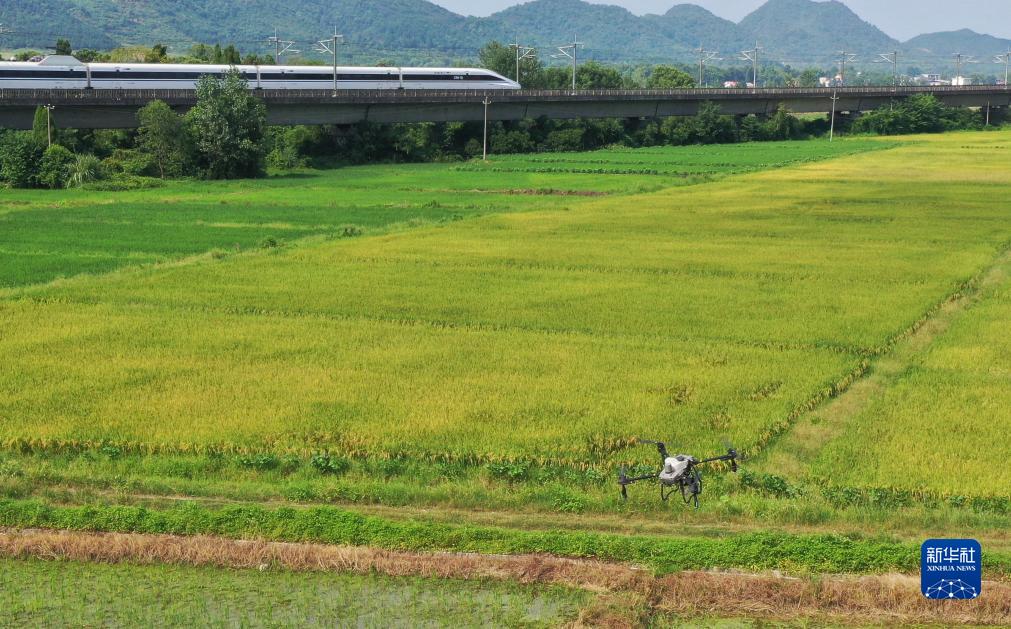 無(wú)人機在江西省新余市分宜縣田間噴灑葉面肥(8月3日攝,無(wú)人機照片)。