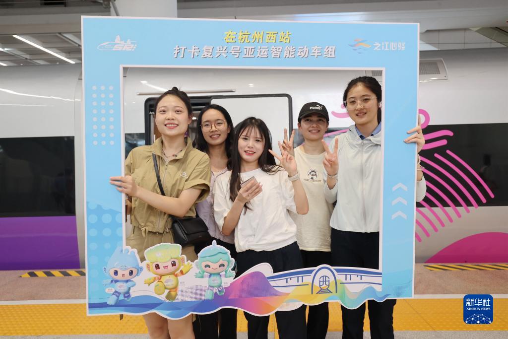8月4日,在浙江省杭州西站,乘客在復興號亞運智能動(dòng)車(chē)組列車(chē)旁合影留念。