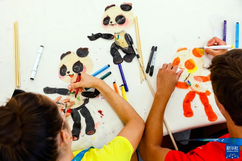 8月2日,在成都大運村的互動(dòng)體驗中心,西班牙運動(dòng)員在繪制熊貓造型的皮影道具。