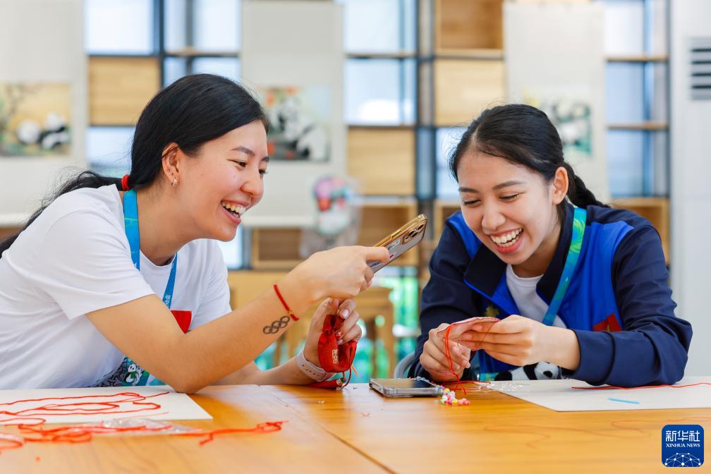 8月3日,在成都大運村的互動(dòng)體驗中心,吉爾吉斯斯坦運動(dòng)員卡妮柯(左)拍攝隊友阿扎爾制作香包的過(guò)程。