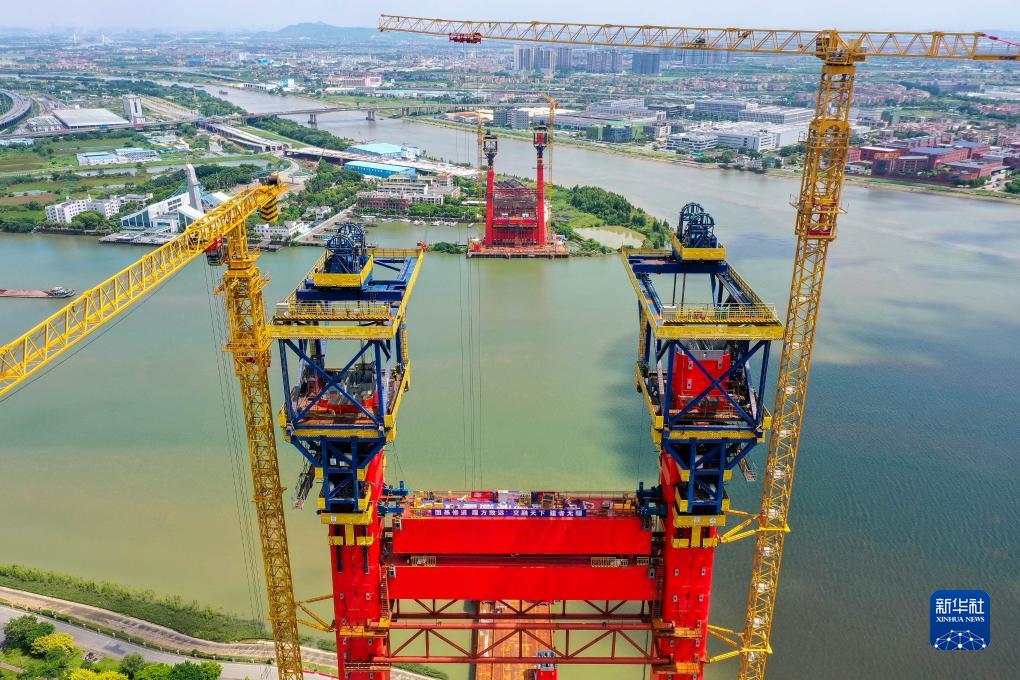 已經(jīng)完成上橫梁吊裝的順德大橋西主塔(無(wú)人機照片,8月4日攝)。