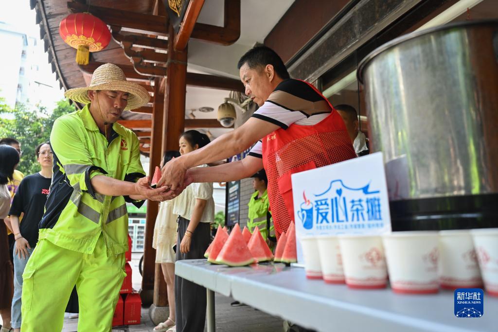8月4日,在福州市鼓樓區軍門(mén)社區愛(ài)心茶攤,工作人員為環(huán)衛工人送上西瓜。