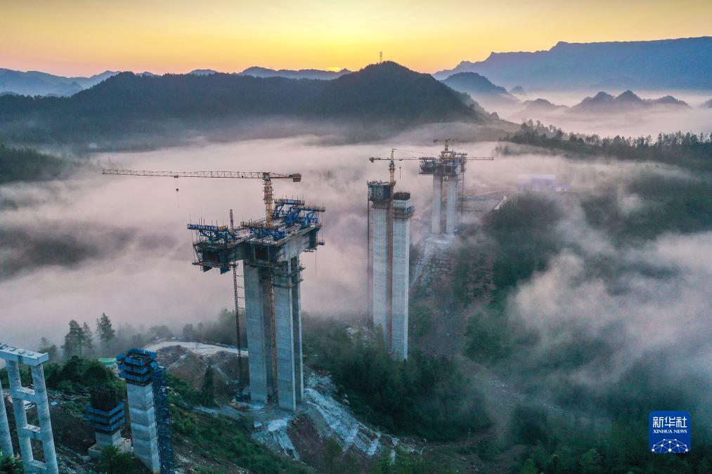 8月4日在湖南省湘西土家族苗族自治州龍山縣拍攝的桑龍高速公路灣檔河特大橋施工現場(chǎng)(無(wú)人機照片)。