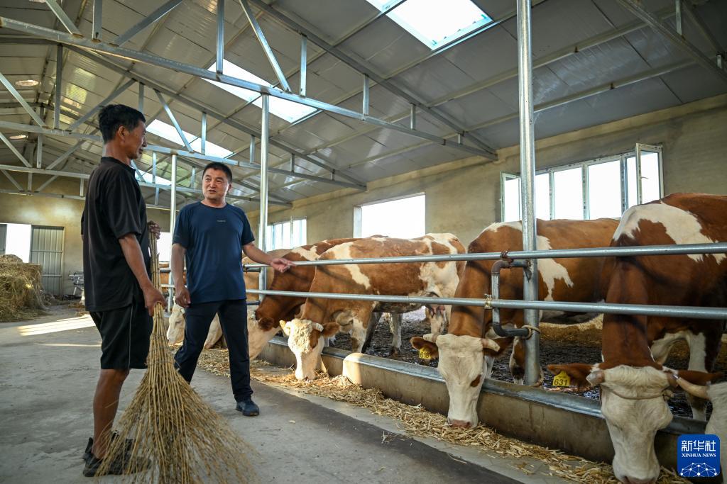 8月3日,在扎魯特旗巨日合鎮,百順養殖專(zhuān)業(yè)合作社負責人楊紹武(右)向養殖戶(hù)李和了解基礎母牛代養情況。