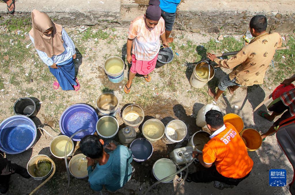 8月3日,在印度尼西亞西爪哇省茂物,人們在送水車(chē)前排隊等候打水。