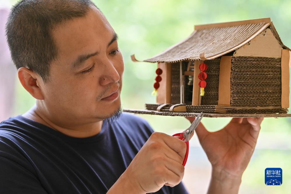 王帥棟在位于山西省太原市萬(wàn)柏林區的工作室內修整瓦楞紙作品(8月1日攝)。