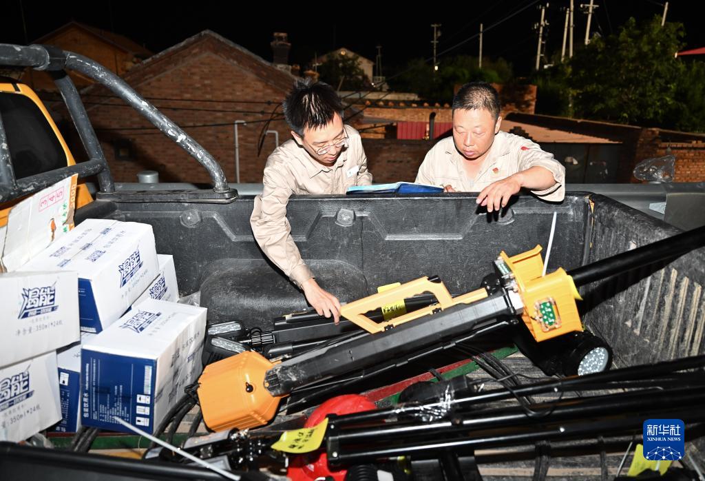 8月4日,國網(wǎng)天津電力工程搶險人員在天津市靜海區臺頭鎮現場(chǎng)核對應急照明燈具準備情況。