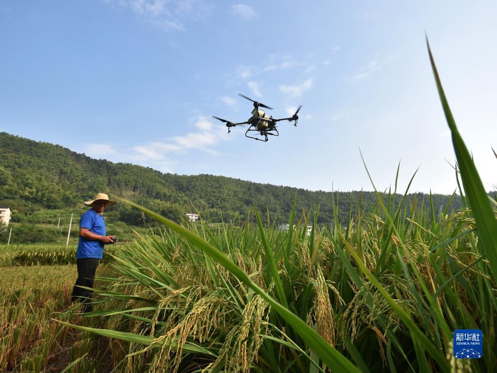 8月5日,在湖南省婁底市雙峰縣石牛鄉上茶村,技術(shù)人員操作植保無(wú)人機為水稻噴葉面肥。