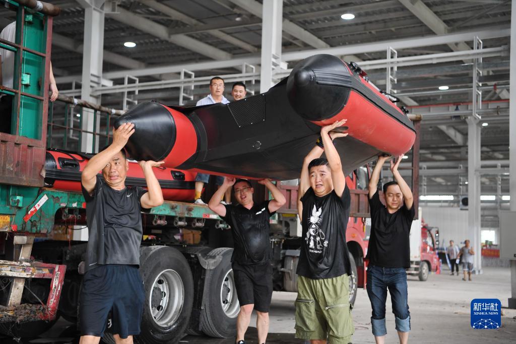 8月5日,工作人員和志愿者在河北省涿州市鋼研物資儲備點(diǎn)內搬運捐贈的沖鋒舟。