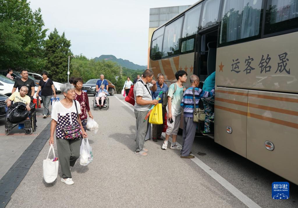 8月5日,北京市房山區青龍湖鎮口頭村村民在安置點(diǎn)登上接他們回家的大巴。