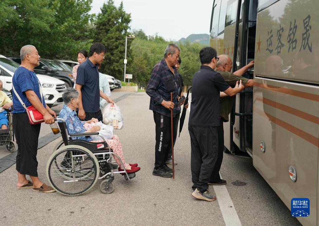 8月5日,北京市房山區青龍湖鎮口頭村村民在安置點(diǎn)登上接他們回家的大巴。