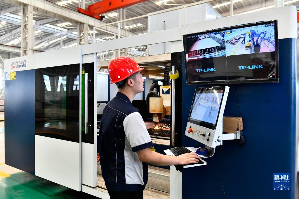 8月5日,在德譽(yù)精工科技(日照)有限公司,工作人員操作激光設備按客戶(hù)要求切割鋼板。