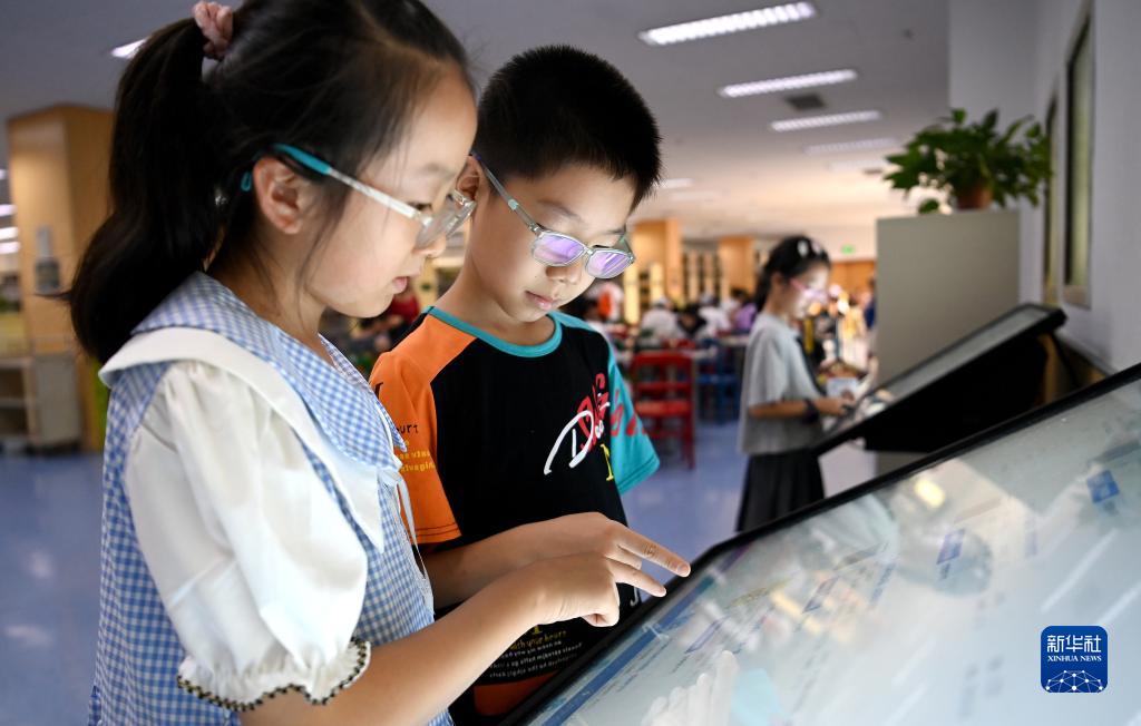 兩名兒童在陜西省圖書(shū)館長(cháng)安路館區查閱圖書(shū)(8月4日攝)。