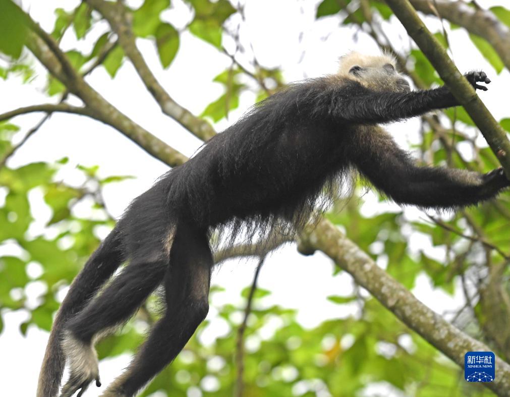 一只白頭葉猴在林間跳躍(8月5日攝)。