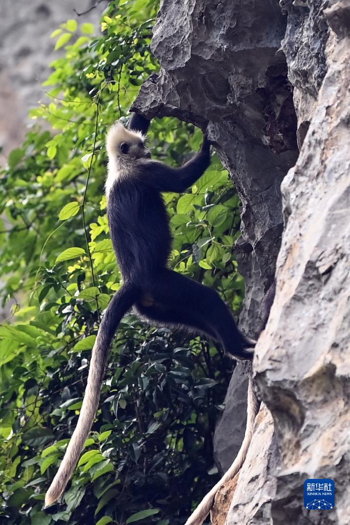 一只白頭葉猴在攀巖轉場(chǎng)覓食(8月5日攝)。