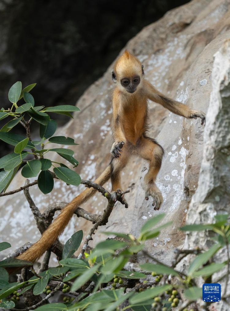 一只白頭葉猴幼猴在巖壁上跳躍(8月5日攝)。