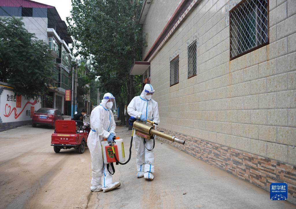 8月6日,在河北省涿州市刁窩鎮白塔村,志愿者在民房前進(jìn)行消殺作業(yè)。