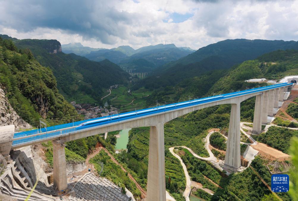 試驗動(dòng)車(chē)組經(jīng)過(guò)位于貴州省貴定縣的貴南高鐵桐子園特大橋(8月4日攝)。