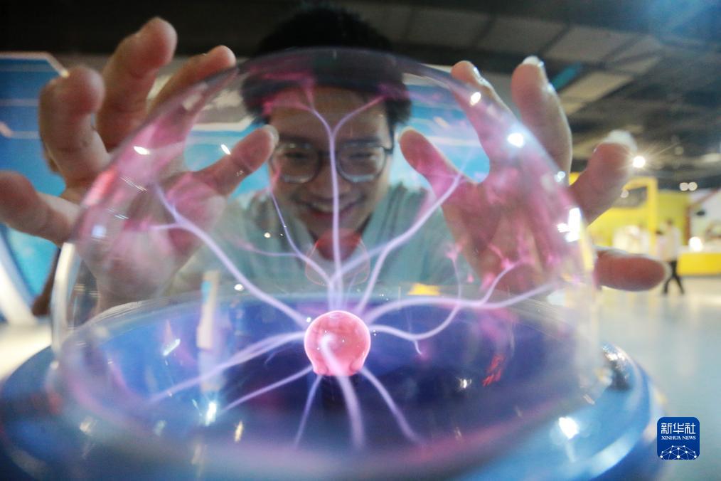8月6日,在江蘇揚州科技館,小朋友在體驗“輝光球”。