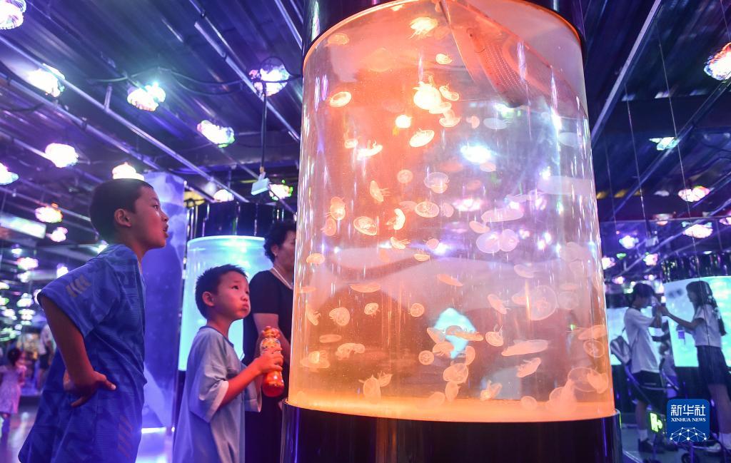 8月6日,家長(cháng)帶著(zhù)孩子在河南洛陽(yáng)龍門(mén)海洋館參觀(guān)。