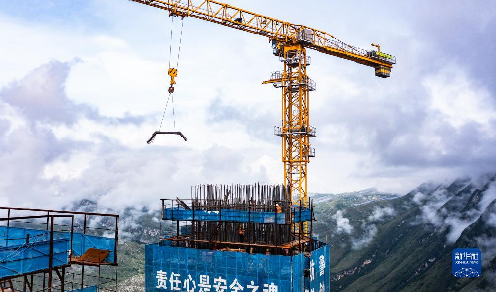 貴州公路集團工人在花江峽谷大橋5號主塔進(jìn)行施工(8月3日攝,無(wú)人機照片)。