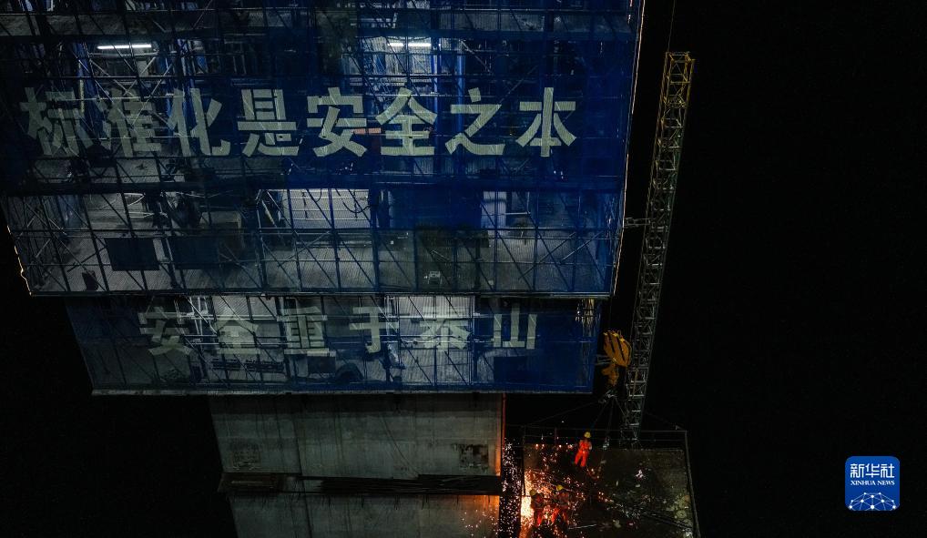 貴州公路集團工人在花江峽谷大橋5號主塔進(jìn)行夜間施工(8月2日攝)。