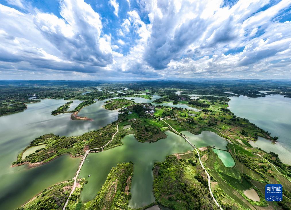 8月6日,湖南桂陽(yáng)舂陵國家濕地公園,綠水、濕地、藍天相映成趣,構成一幅秀美的夏日生態(tài)畫(huà)卷(無(wú)人機照片)。