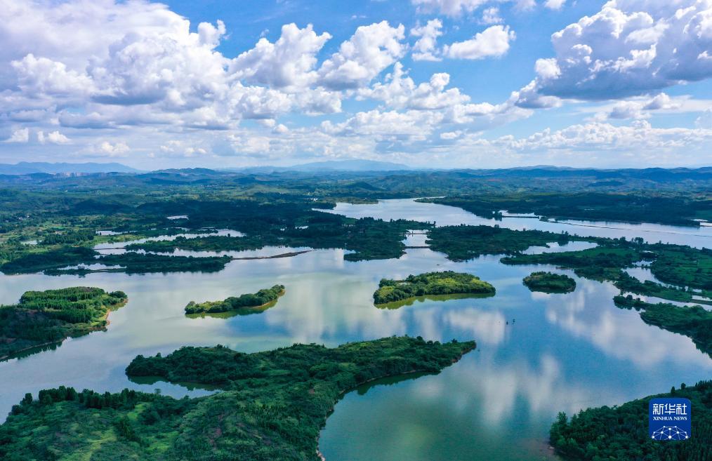 8月6日,湖南桂陽(yáng)舂陵國家濕地公園,綠水、濕地、藍天相映成趣,構成一幅秀美的夏日生態(tài)畫(huà)卷(無(wú)人機照片)。