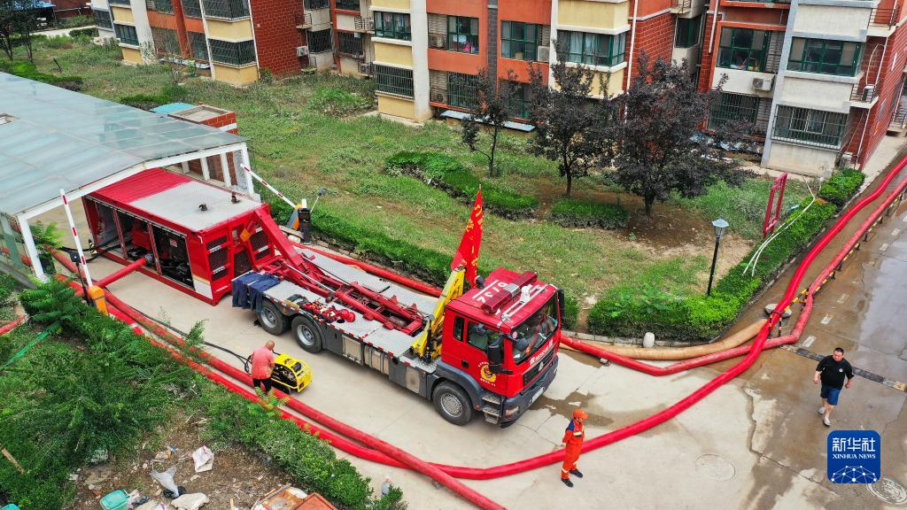 8月7日,邯鄲市消防救援支隊排水設備在河北省涿州市一小區地下車(chē)庫排澇現場(chǎng)作業(yè)(無(wú)人機照片)。