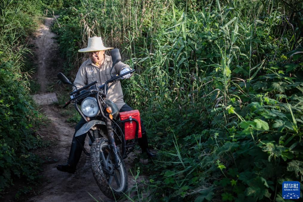 8月1日,在湖北石首麋鹿國家級自然保護區,巡護員王傳軍在騎車(chē)巡邏途中駛過(guò)坑道。