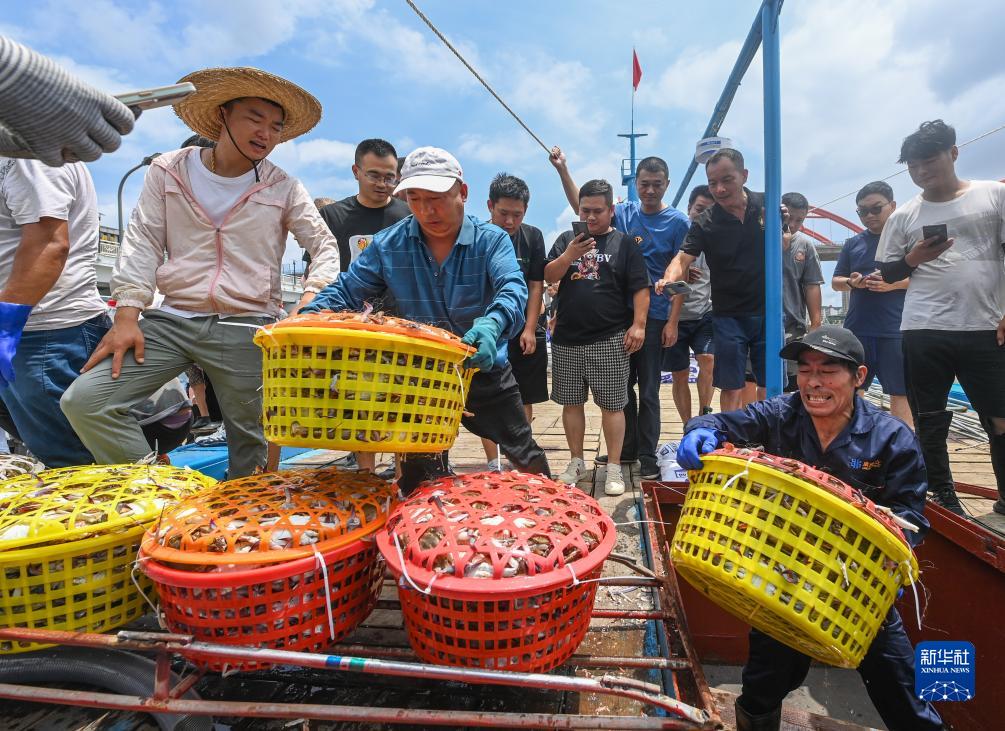 8月7日首批開(kāi)漁歸來(lái)的漁運船靠泊在舟山普陀沈家門(mén)舟山國際水產(chǎn)城碼頭,漁民把整筐的梭子蟹運送上岸。