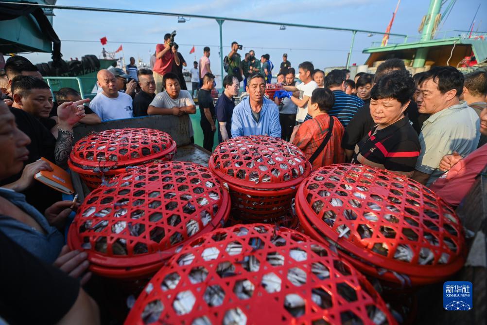 8月7日首批開(kāi)漁歸來(lái)的漁運船靠泊在舟山普陀沈家門(mén)舟山國際水產(chǎn)城碼頭,漁民把整筐的梭子蟹運送上岸裝車(chē)。