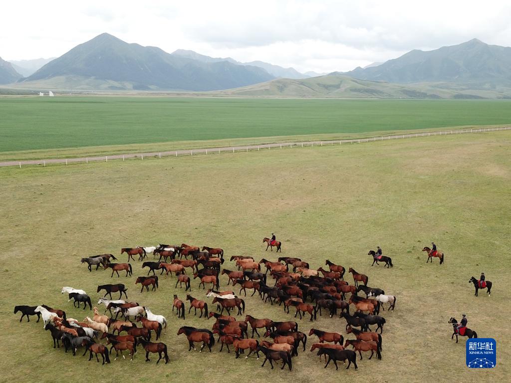 這是8月6日在山丹馬場(chǎng)一場(chǎng)有限責任公司拍攝的馬群(無(wú)人機照片)。