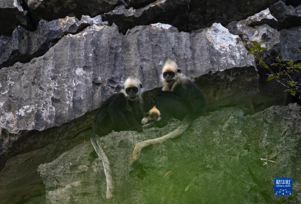 8月5日清晨,兩只母猴保護著(zhù)一只小“金猴”。幼猴渾身金毛,被人們稱(chēng)為“金猴”。