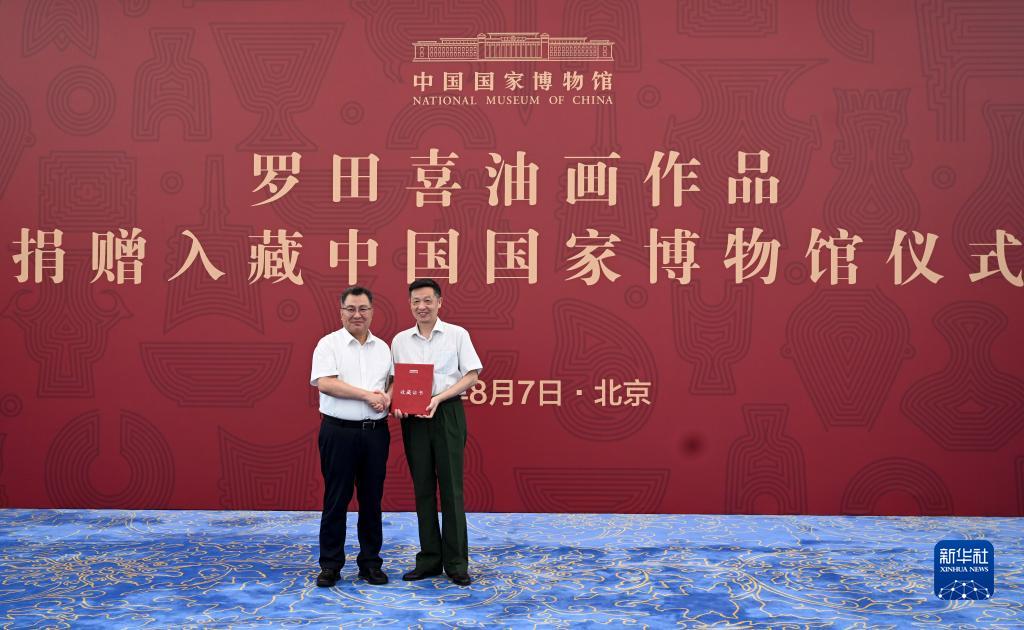 8月7日,中國國家博物館館長(cháng)王春法(左)向油畫(huà)家羅田喜頒發(fā)收藏證書(shū)。