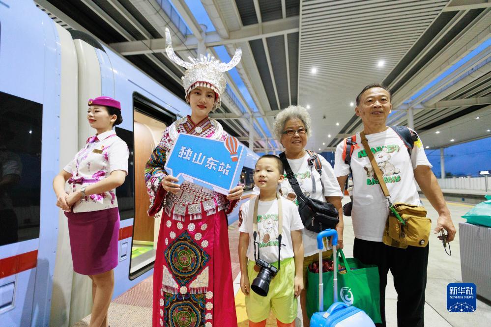 8月8日,旅客在貴陽(yáng)北站和身著(zhù)民族服裝的乘務(wù)員合影留念。