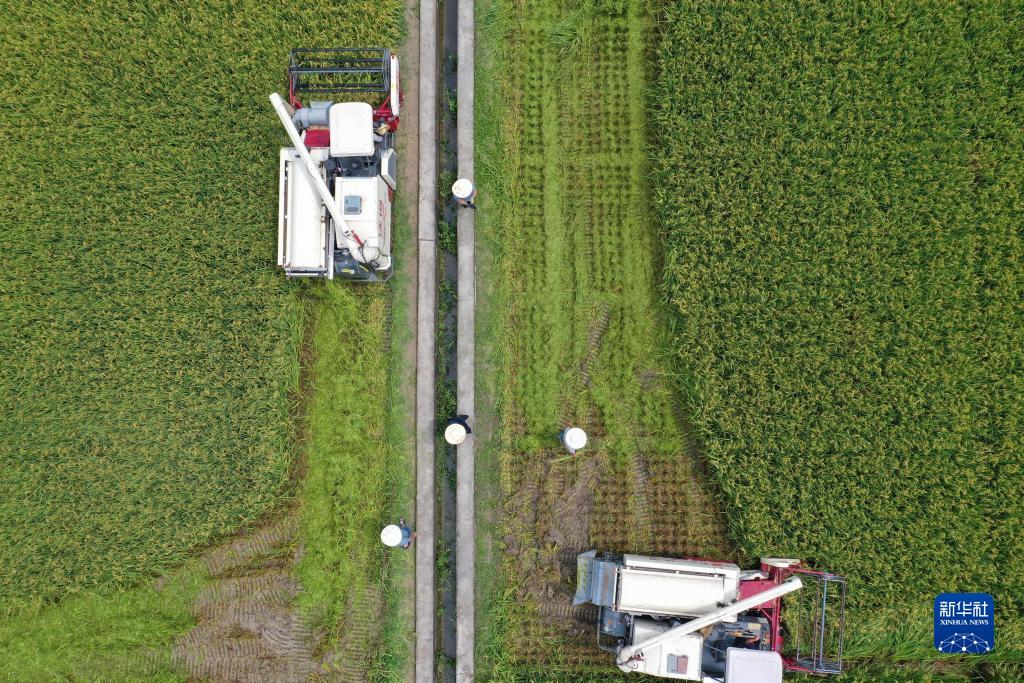 8月7日,在湖南省邵陽(yáng)市隆回縣羊古坳鎮雷峰村超級雜交水稻高產(chǎn)攻關(guān)科研基地,農機手駕駛收割機收割再生稻(無(wú)人機照片)。