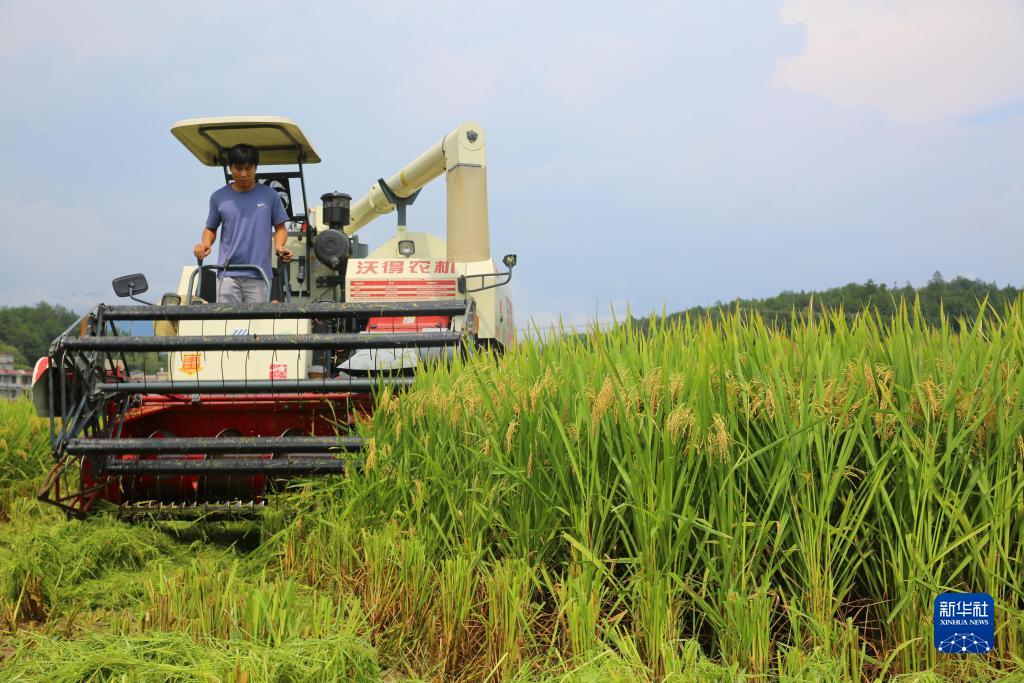 8月7日,在湖南省邵陽(yáng)市隆回縣羊古坳鎮雷峰村超級雜交水稻高產(chǎn)攻關(guān)科研基地,農機手駕駛收割機收割再生稻。