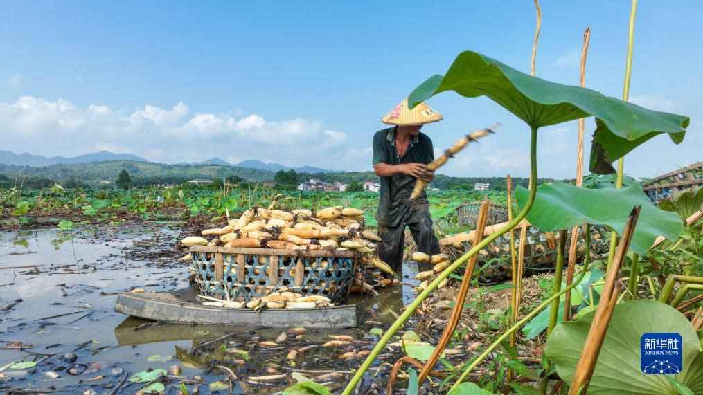 8月8日,在湖南省常寧市板橋鎮蓮藕種植基地,藕農在采收蓮藕(無(wú)人機照片)。
