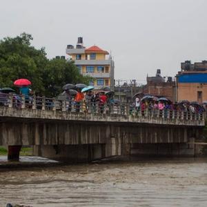 8月8日,在尼泊爾加德滿(mǎn)都,人們望著(zhù)漲水的河流。