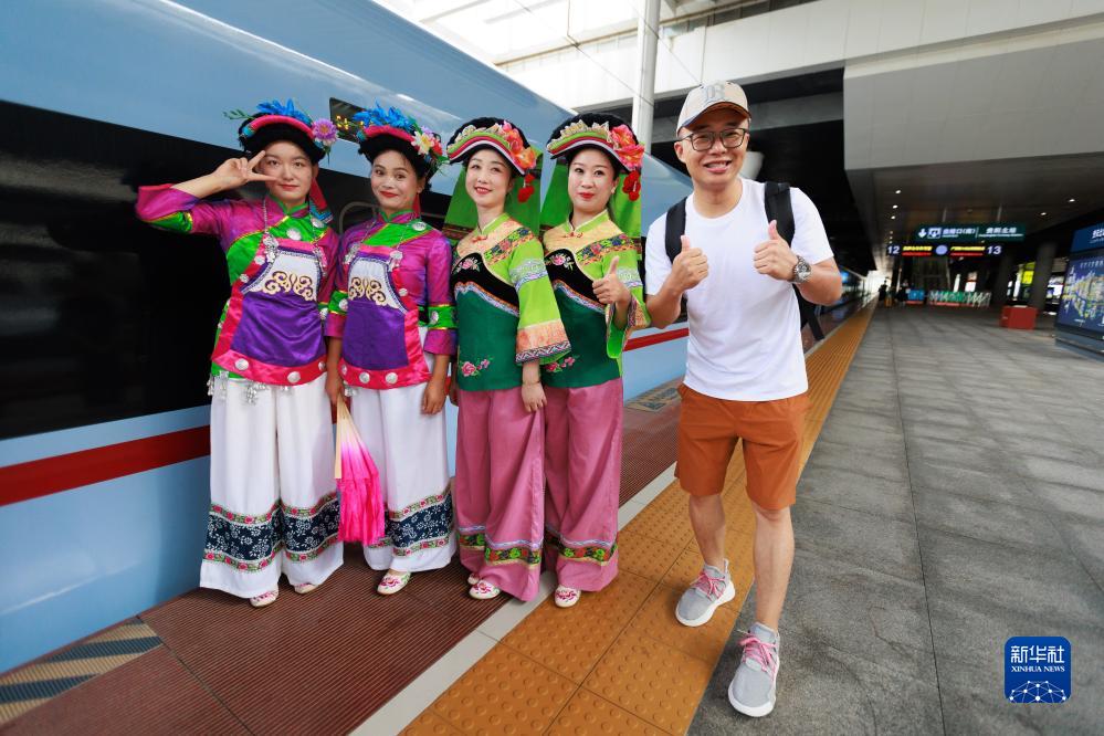8月8日,身著(zhù)少數民族特色服裝的工作人員在D6155次列車(chē)旁迎接旅客。