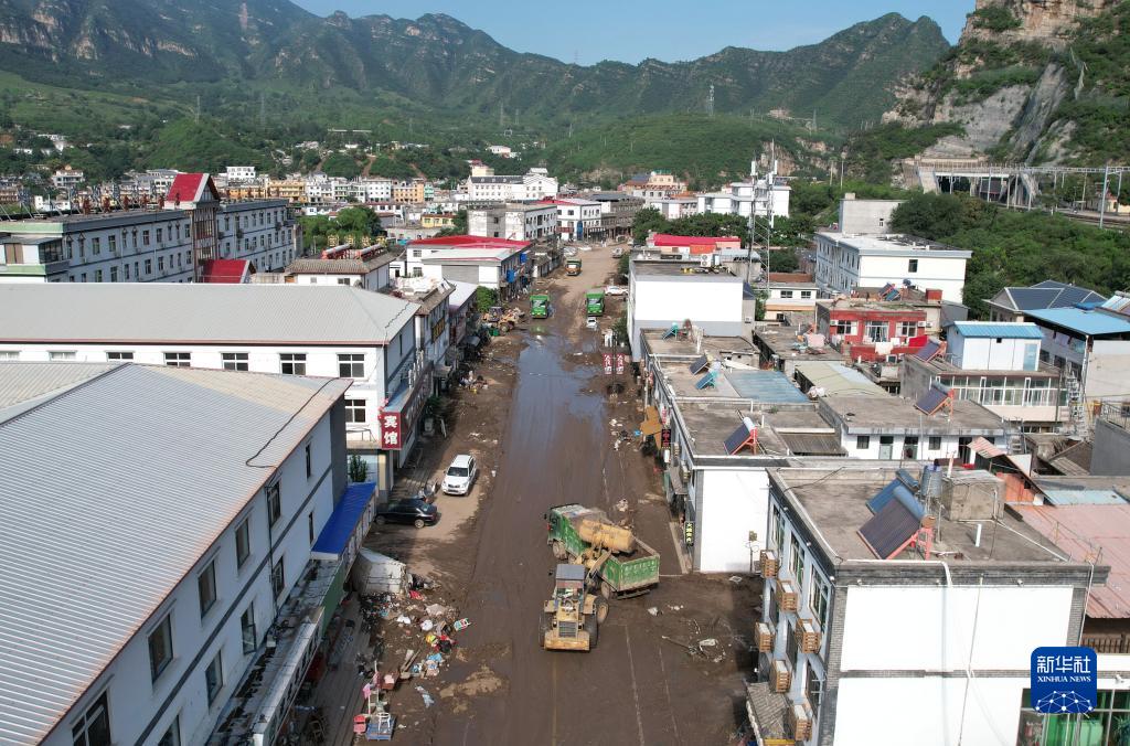 8月8日,在淶水縣三坡鎮下莊村,工人操作機械設備清理道路上的淤泥(無(wú)人機照片)。