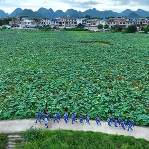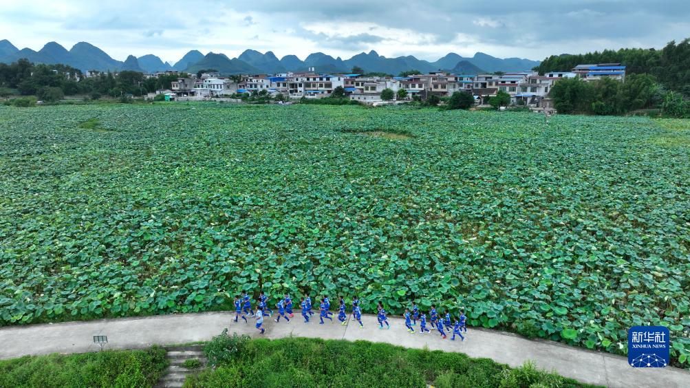 8月7日傍晚,孩子們在荷塘邊跑步鍛煉體能(無(wú)人機照片)。