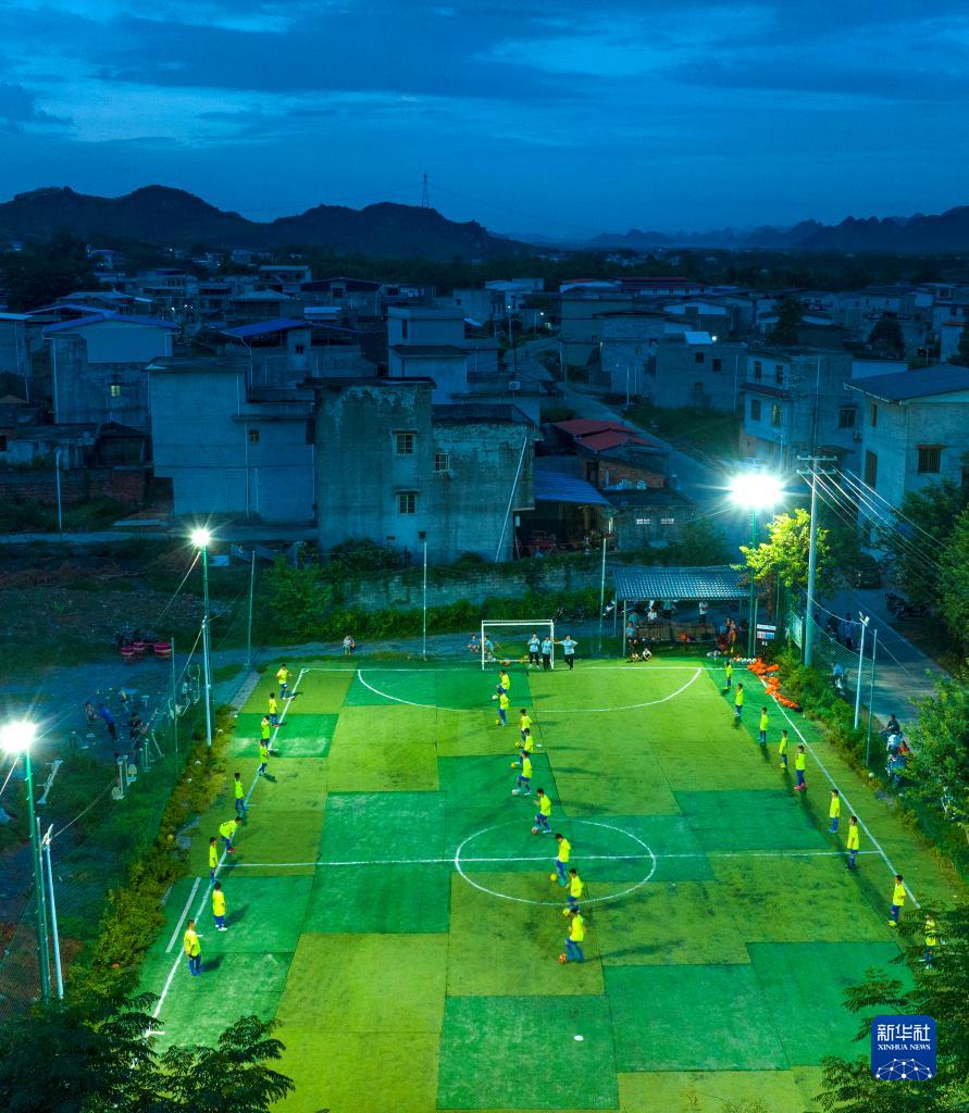 平地屯是位于廣西柳州市柳江區穿山鎮的一個(gè)小山村。8月7日晚,為期近1個(gè)月的平地屯暑期公益足球夏令營(yíng)結束,一場(chǎng)匯報訓練成果的足球對抗賽在村里的綠茵場(chǎng)上打響,吸引眾多村民觀(guān)賽。2020年,平地屯的村民組成義務(wù)勞動(dòng)隊,為孩子們修建專(zhuān)用足球場(chǎng),社會(huì )愛(ài)心人士為他們捐贈了人工草坪、球門(mén)、球場(chǎng)照明燈等設施,公益足球教練定期免費為孩子們培訓,眾人聯(lián)合起來(lái),給村里喜歡足球的孩子們點(diǎn)燃了綠茵夢(mèng)想。