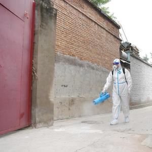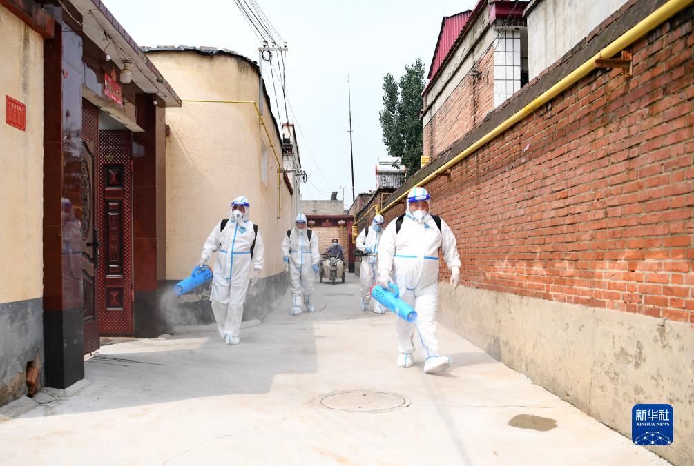 8月8日,工作人員在涿州市桃園街道忠義店村開(kāi)展防疫消殺作業(yè)。