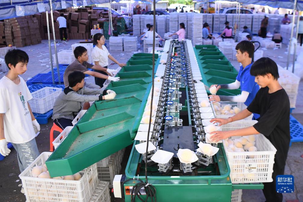 8月8日,工作人員在炎陵縣下村鄉黃桃收購點(diǎn)分揀黃桃。