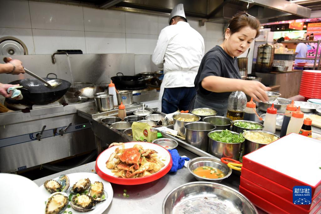 8月7日,青島市市南區浮山所市集一店家在為顧客加工海鮮。