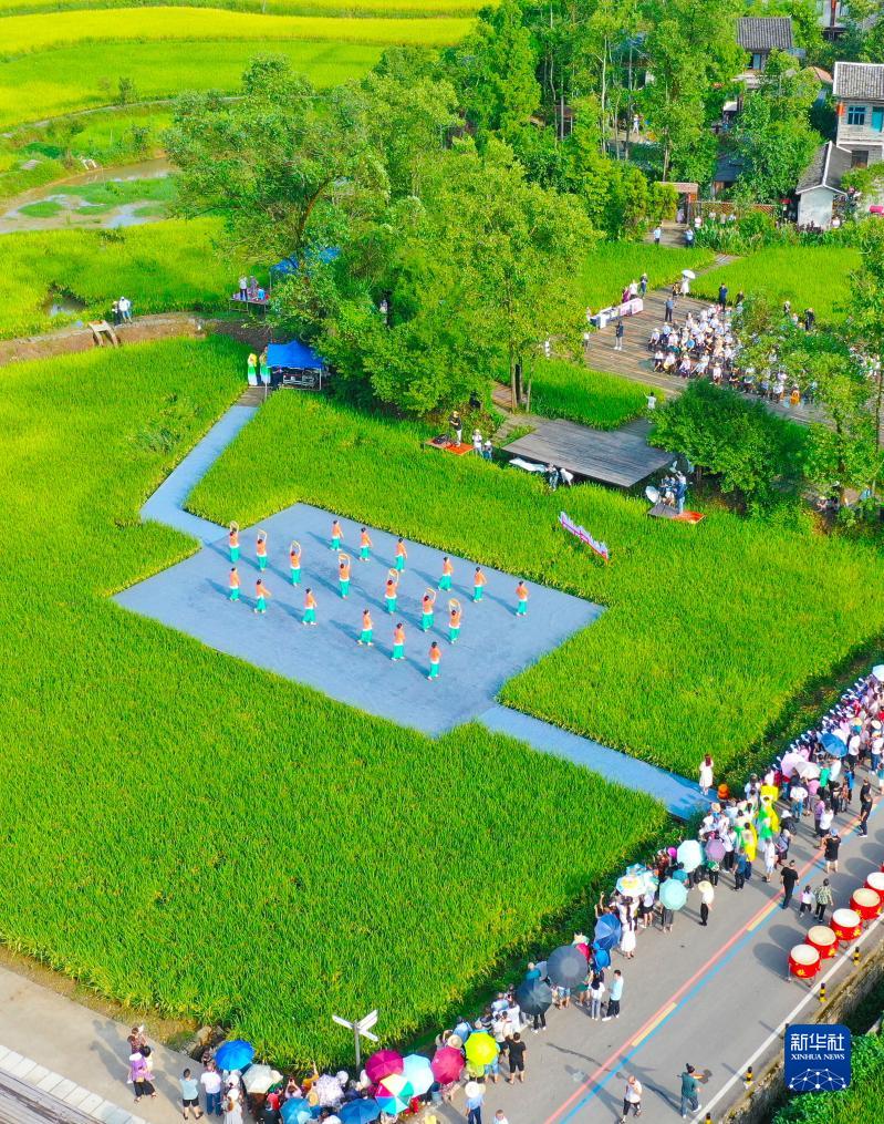 8月8日,在重慶市梁平區安勝鎮舉行的第六屆長(cháng)江三峽(梁平)曬秋節上,演員們在稻田舞臺上表演(無(wú)人機照片)。