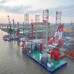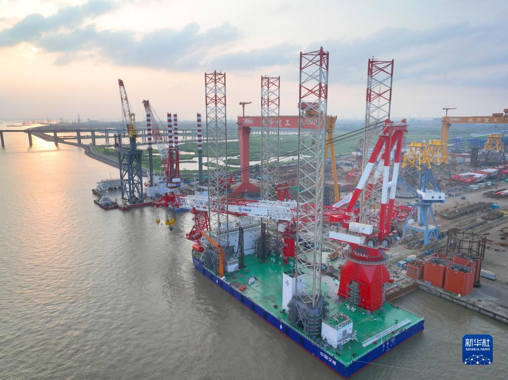 該風(fēng)電安裝平臺長(cháng)133.8米,型寬50米,型深11米,總重約28000噸,艉部右舷設2500噸繞樁式全回轉起重機,適用于砂性土、粘性土或類(lèi)似地質(zhì)作業(yè),主要用于15兆瓦及以上機組設備安裝,可同時(shí)運載2套15兆瓦風(fēng)機機組設備,最大作業(yè)水深70米。新華社發(fā)(許叢軍 攝)