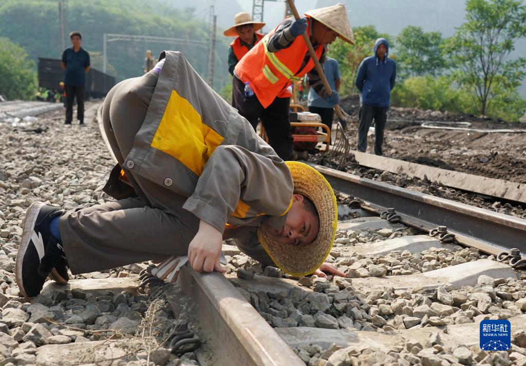 8月8日,一名工作人員在檢查搶修后的鐵軌,確保通車(chē)順利。